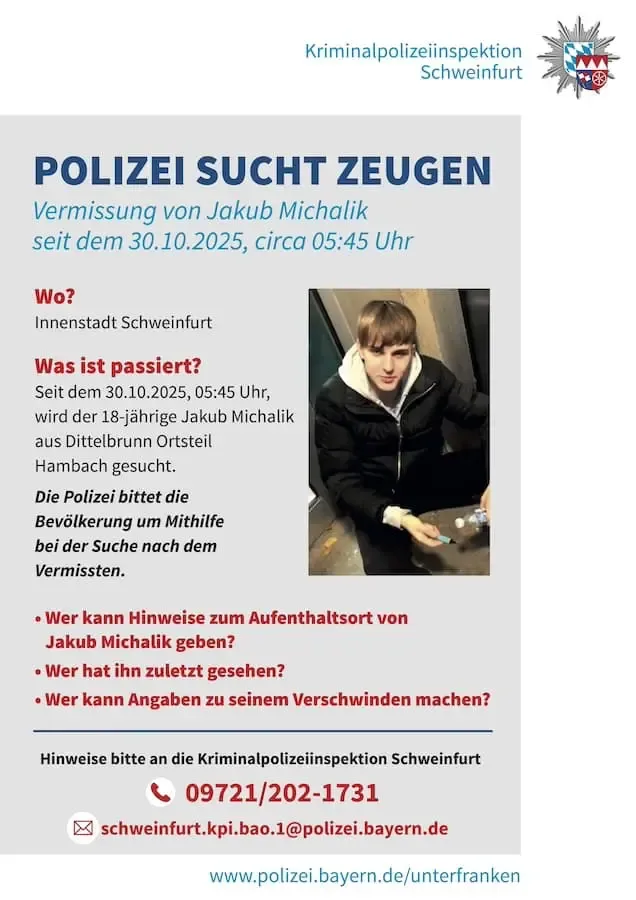 Der 18-jährige Jakub Michalik aus dem Dittelbrunner Ortsteil Hambach wird weiterhin vermisst. Der junge Mann ist seit dem 30. Oktober 2025 spurlos verschwunden. Zuletzt wurde er gegen 05:45 Uhr in der Innenstadt von Schweinfurt gesehen.