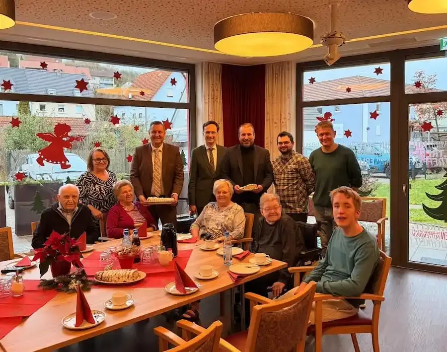 Zur symbolischen Übergabe brachte der stellvertretende Obermeister der Bäckerinnung Mainfranken, Markus Gürsching aus Gerolzhofen, die Christstollen persönlich zum AWO-Seniorenzentrum nach Schonungen. Begleitet wurde er dabei von Landrat Florian Töpper sowie Bürgermeister Stefan Rottmann, der zugleich stellvertretender Vorsitzender des AWO-Bezirksverbands ist.