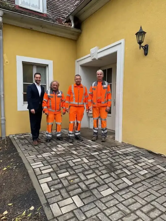 Die Rampe wurde in Eigenleistung durch den gemeindlichen Bauhof errichtet. Im Zuge der Bauarbeiten entfernte das Team das bestehende Pflaster, setzte neue Leistensteine zur Abgrenzung und glich das Gelände für eine ebene Fläche aus.