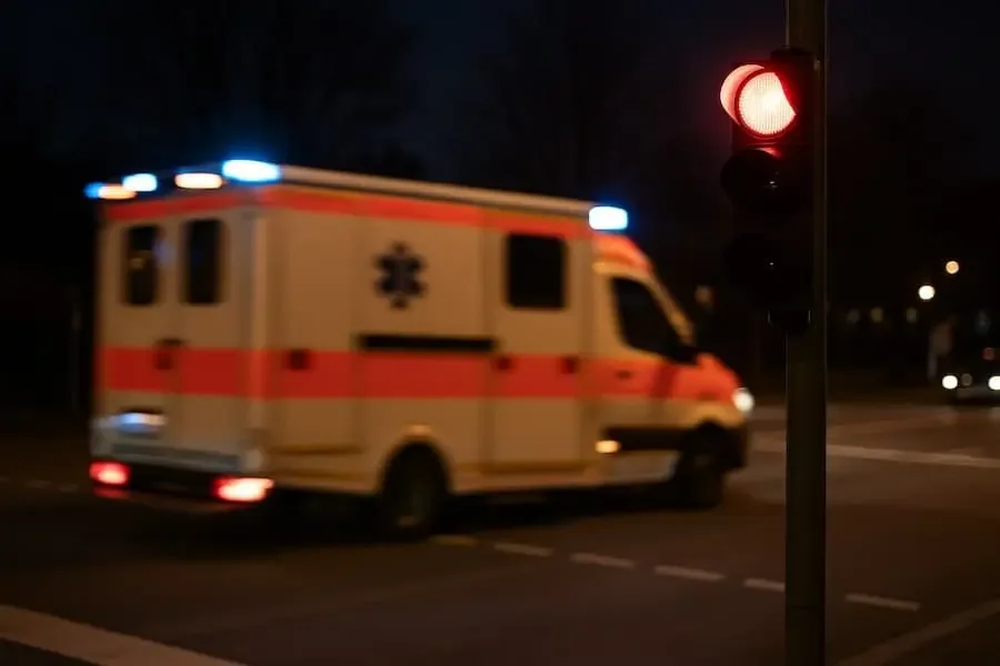 Gegen 22:00 Uhr befand sich der Rettungswagen auf einer Einsatzfahrt nach Oerlenbach. Blaulicht und Martinshorn waren eingeschaltet. An der Kreuzung Ostring / Münnerstädter Straße fuhr das Einsatzfahrzeug ordnungsgemäß bei roter Ampel in den Kreuzungsbereich ein. Hinter ihnen fiel der Besatzung ein schwarzer BMW auf, der plötzlich sein Warnblinklicht aktivierte und dem Rettungswagen ebenfalls über die rote Ampel folgte.