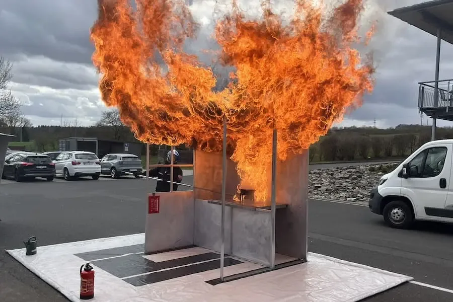 Ein Schwerpunkt lag auf dem richtigen Umgang mit Feuerlöschern. Nach einer theoretischen Einführung zu verschiedenen Brandarten und Löschmitteln konnten die Teilnehmenden das Gelernte direkt praktisch anwenden. Auf dem Außengelände der Werkstatt wurde ein Brand simuliert, den die Mitarbeitenden eigenständig mit Feuerlöschern bekämpften.
