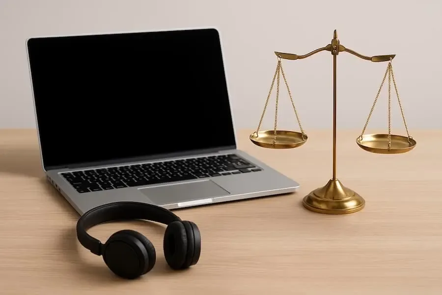 Symbolfoto zu BGH-Urteil über Online-Coaching: Laptop, Kopfhörer und goldene Waage auf Holzschreibtisch