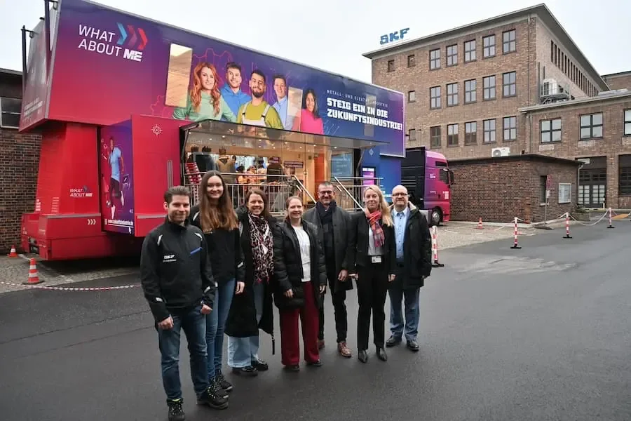 Rund 500 Acht- und Neuntklässlerinnen und -klässler aus 17 Schulen der Region Main-Rhön haben beim dritten Gastspiel des Ausbildungstrucks der Bayerischen Metall- und Elektroindustrie auf dem Gelände von SKF in Schweinfurt verschiedene Ausbildungsberufe kennengelernt. Der Truck stand zwei Wochen lang direkt vor dem SKF-Trainingscenter – und bot Berufsorientierung zum Anfassen.