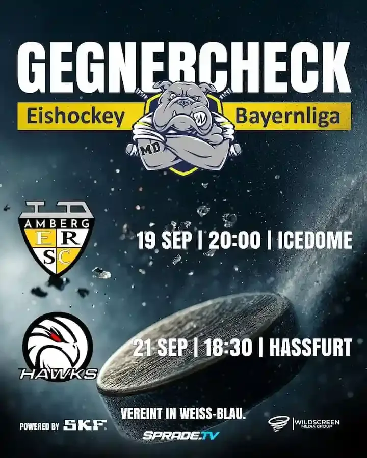 Gegnercheck der Mighty Dogs: Heimspiel gegen ERSC Amberg am 19. September im Icedome, Derby in Haßfurt am 21. September