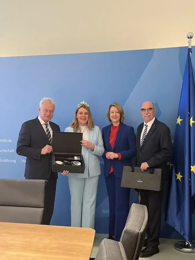Der Präsident des Fränkischen Weinbauverbands, Artur Steinmann, und die Fränkische Weinkönigin Antonia Kraiß trafen in Berlin auf den Bundeslandwirtschaftsminister Alois Rainer. Das Gespräch fand auf Vermittlung der Bundestagsabgeordneten Dr. Anja Weisgerber (CSU) statt.