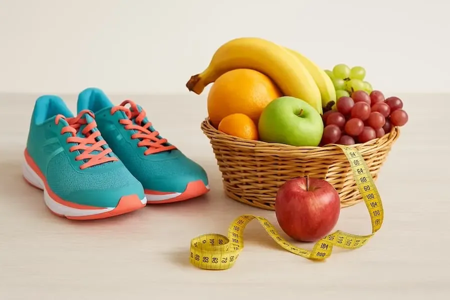 Laufschuhe neben einem Obstkorb mit Maßband – Symbol für gesunde Ernährung, Bewegung und Motivation durch die AOK Bayern.