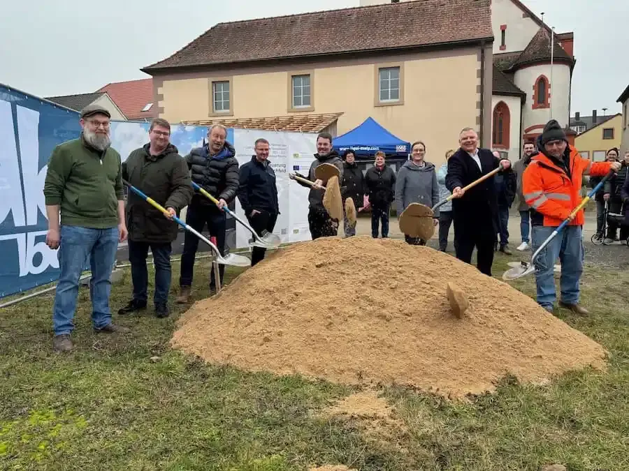Mit einem symbolischen Spatenstich hat im Volkacher Ortsteil Eichfeld die Umsetzung des Projekts „Dorferneuerung Eichfeld“ begonnen. Nach rund zehn Jahren intensiver Planungsarbeit startet nun die konkrete Bauphase. Zahlreiche Bürgerinnen und Bürger waren bei diesem Meilenstein vor Ort.