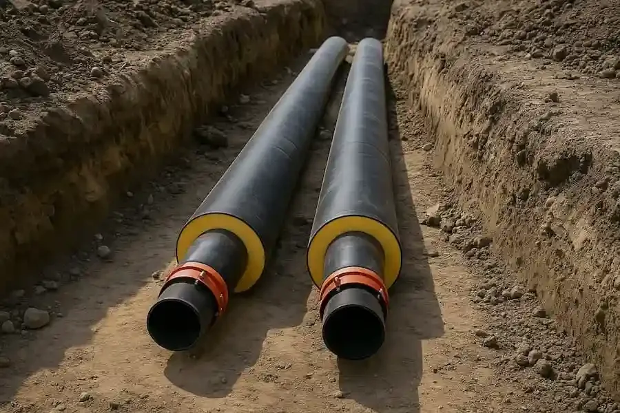 In einer Baugrube verlegte isolierte Fernwärmerohre als Symbol für den Ausbau des Fernwärmenetzes