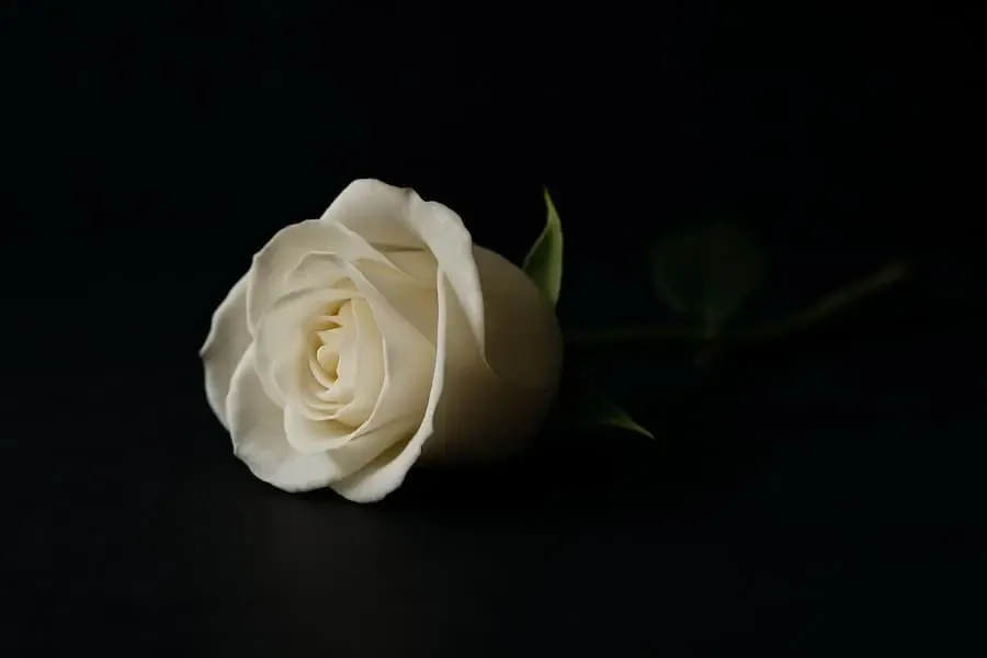 Weiße Rose auf dunklem Hintergrund als stilles Symbol für Trauer und Gedenken am Volkstrauertag.