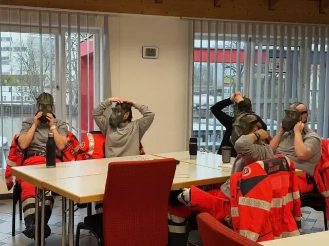Johanniter aus Schweinfurt üben während der CBRN-Ausbildung das Anlegen von Atemschutzmasken