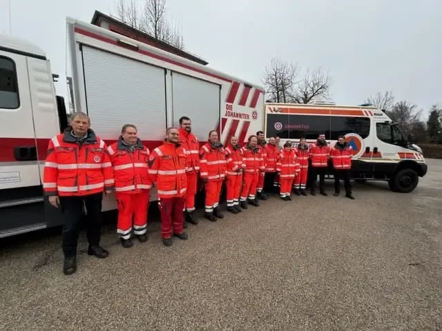 Johanniter-Bereitschaft Schweinfurt nach CBRN-Ausbildung vor Einsatzfahrzeugen