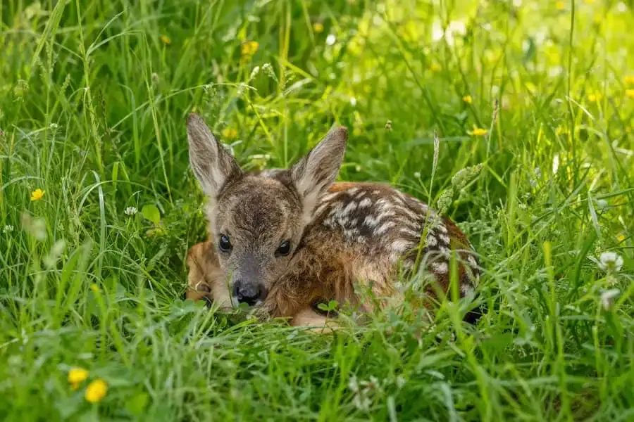 Viele Jungtiere setzen auf Tarnung statt Flucht. Rehkitze oder Junghasen liegen oft regungslos im hohen Gras und wirken verlassen. Tatsächlich befinden sich die Muttertiere meist in der Nähe und kehren regelmäßig zurück.