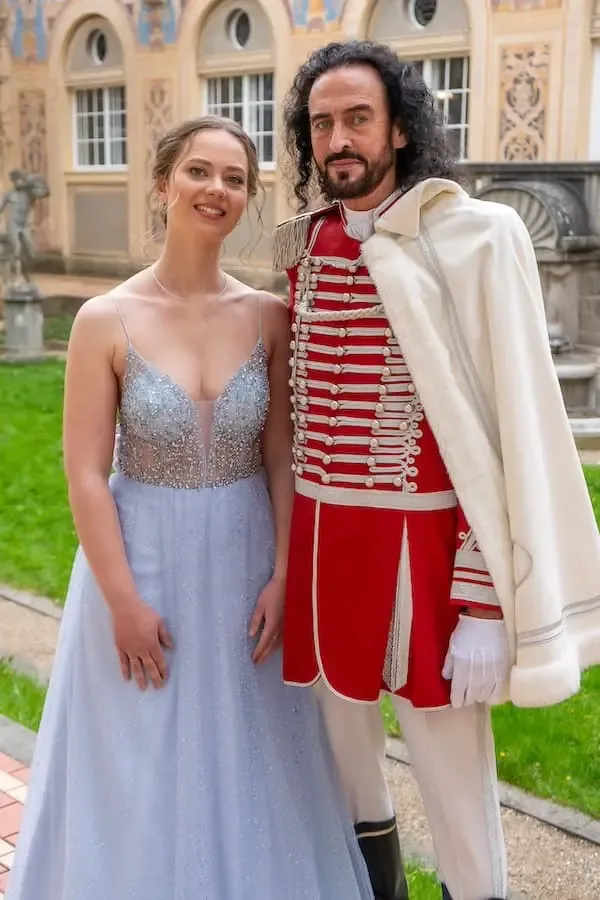 Die neue Quellenkönigin Lea Söder ist voller Vorfreude auf das Rakoczy-Fest 2026 und posiert gemeinsam mit Fürst Férenc Rákóczi II. vor historischer Kulisse in Bad Kissingen. Foto: Nina Pereira Santo / Bayer. Staatsbad Bad Kissingen GmbH