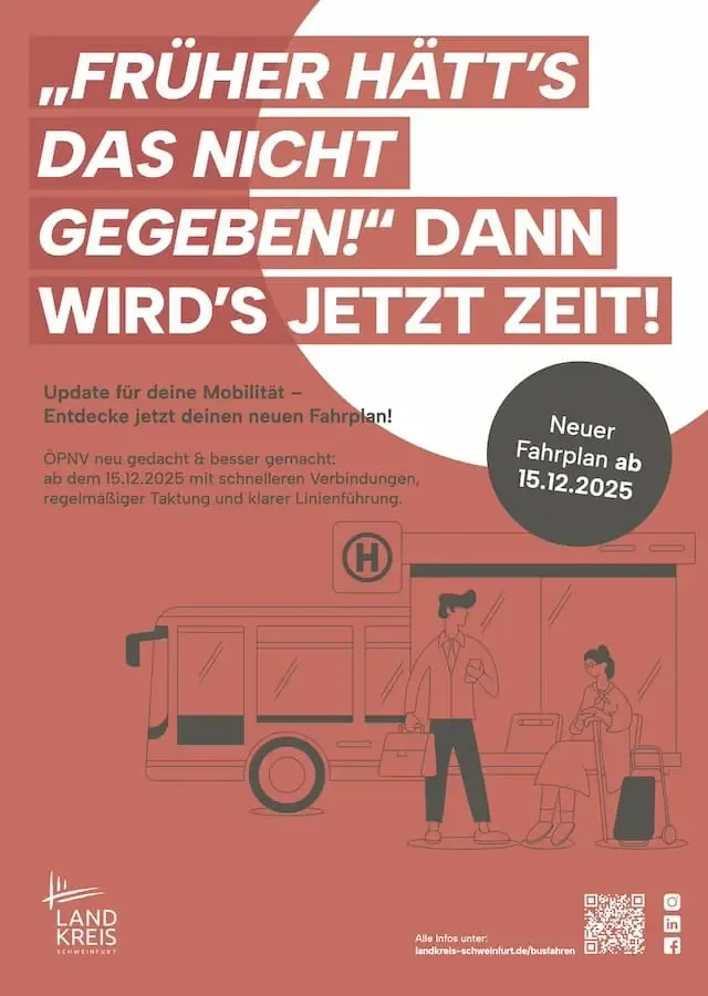 Der Landkreis Schweinfurt startet am 15. Dezember mit einem völlig neuen öffentlichen Personennahverkehr (ÖPNV). Ein überarbeiteter Liniennetzplan mit neuen Fahrplänen sorgt künftig für mehr Verbindungen, kürzere Wartezeiten und ein einheitliches System aus Bus, Bahn und dem bedarfsorientierten Fahrdienst callheinz.