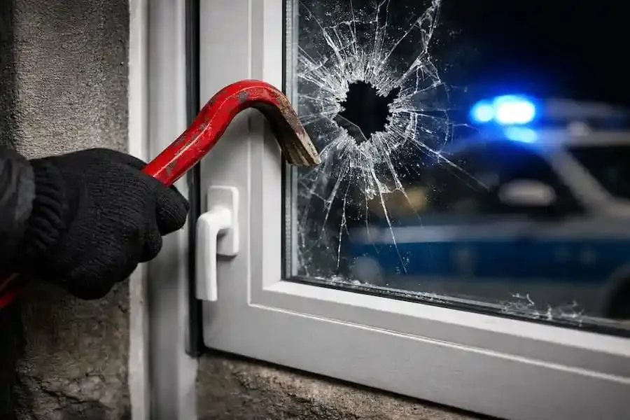 Einbruch in eine Spielothek in Bad Neustadt an der Saale: Aufgebrochenes Fenster mit Werkzeug, Polizei ermittelt nach nächtlichem Einbruch.