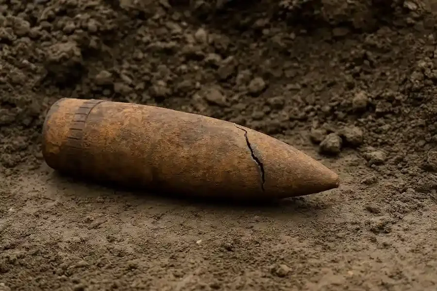 Symbolfoto einer alten Phosphorbombe im Erdreich – Bombenfund bei Baggerarbeiten in Sennfeld und Gochsheim