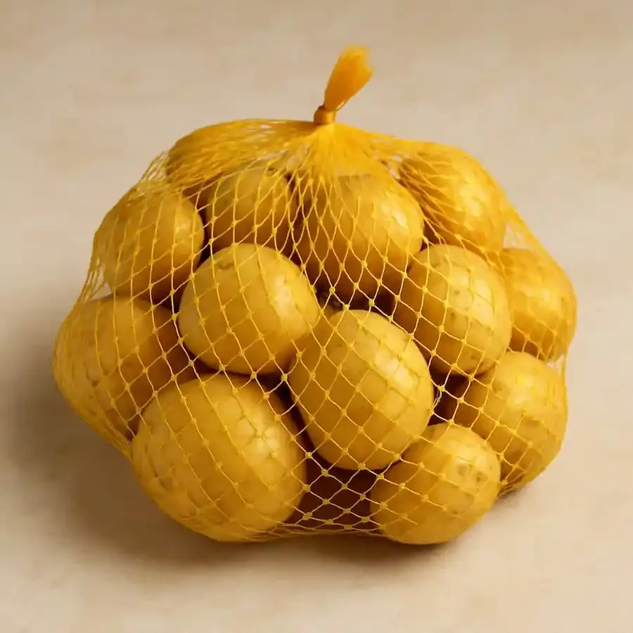 Netz mit frischen gelben Kartoffeln in einer gelben Netztasche auf hellem Untergrund.