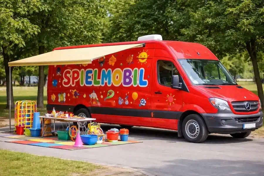 Das Spielmobil der Stadt Schweinfurt bietet Kindern während der Ferien abwechslungsreiche Spiel- und Bastelmöglichkeiten. KI-generiertes Symbolbild