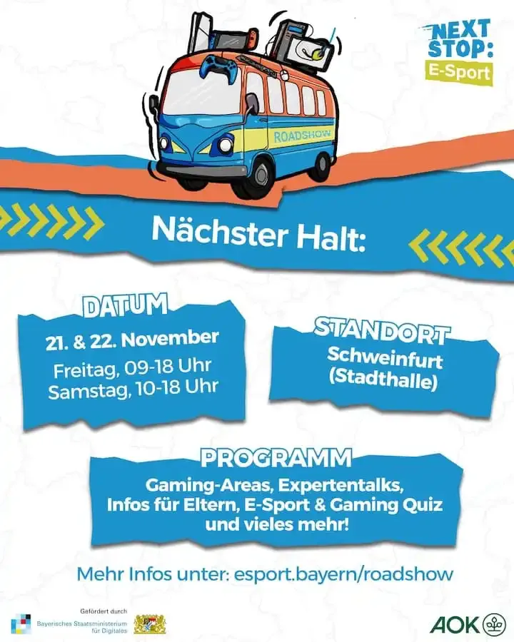 Am 21. und 22. November 2025 macht die Roadshow Halt in Schweinfurt – in der Stadthalle. Hier erwartet Besucherinnen und Besucher ein abwechslungsreiches Programm mit Gaming-Quiz, Showmatches, Keynotes und einer großen Freeplay Area.
