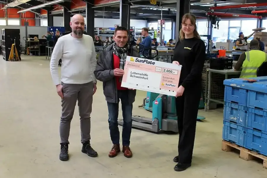 Eine nachhaltige Idee trifft auf soziales Engagement: Das Schweinfurter Unternehmen SunPlate hat der Werkstatt für behinderte Menschen Sennfeld, die zur Lebenshilfe Schweinfurt gehört, eine Spende in Höhe von 2.000 Euro überreicht. Am Montag (19. Januar 2026) übergab Vertriebsassistentin Amelie Kranig einen symbolischen Scheck an Werkstattleiter Günter Scheuring.