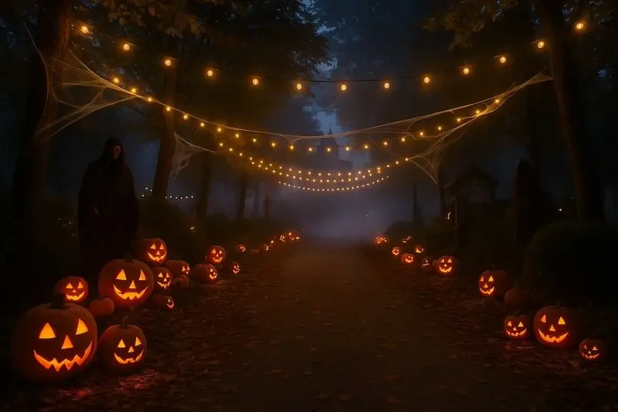 Halloween-Dekoration im Freizeitpark mit Kürbissen, Lichterketten und Nebelstimmung als Symbolbild für den Grusel-Ausflug des KJR Schweinfurt 2025.