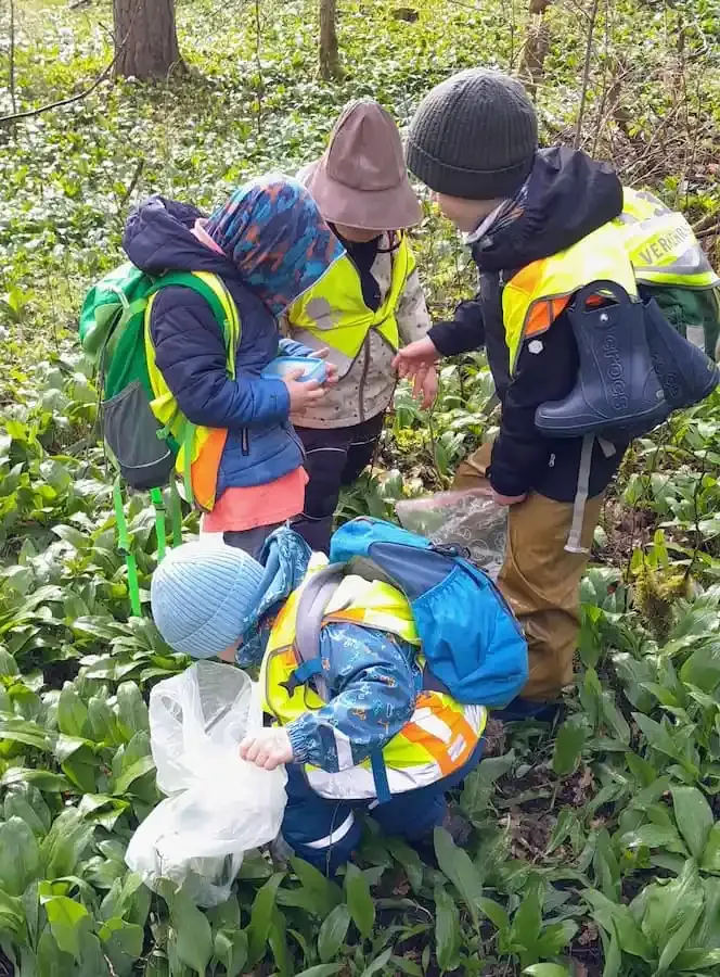 Ein erstes Ziel war das beliebte „Kinderhexenhaus“, wo die Kinder eine gemütliche Frühstückspause einlegten. Frisch gestärkt ging es anschließend weiter. Schon bald entdeckten die Kinder die ersten Bärlauchpflanzen. Mit kleinen Dosen ausgestattet, sammelten sie eifrig ihre eigenen Vorräte und lernten dabei spielerisch, wie man die Pflanze erkennt und verantwortungsvoll mit der Natur umgeht.