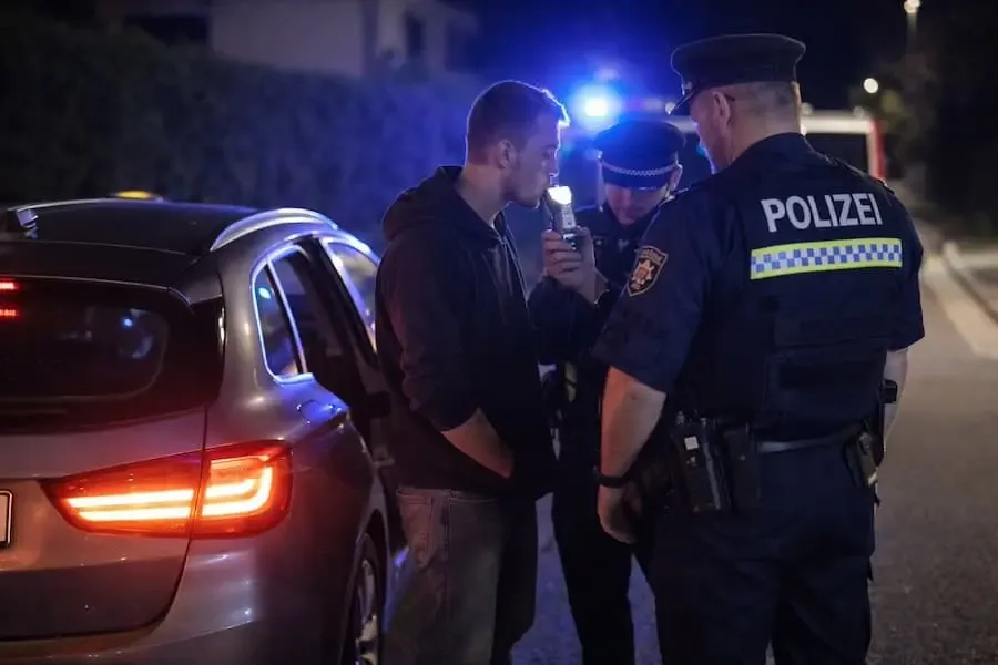 Polizeikontrolle in Sulzfeld: Ein BMW-Fahrer wurde nach seiner Flucht vor der Kontrolle später an seiner Wohnadresse gestellt – Alkoholtest positiv. Bild: KI-generiert
