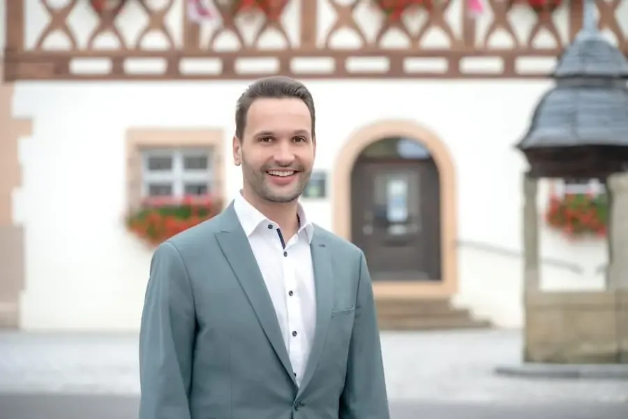 Bürgermeister Manuel Kneuer steht vor dem Rathaus in Gochsheim und blickt lächelnd in die Kamera – Porträtaufnahme im Rahmen seiner Zwischenbilanz 2025.