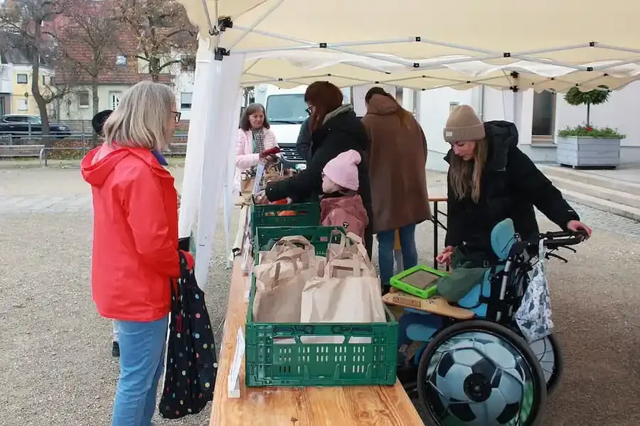 Auf dem Wochenmarkt vor dem Rathaus ist am vergangenen Freitag ein besonderes Zeichen für Teilhabe und Inklusion gesetzt worden. Die zur Lebenshilfe Schweinfurt gehörende Schule am Bach präsentierte dort ihren „KidsMarktstand“ und verkaufte mit ihren Schülerinnen und Schülern Obst und Gemüse.