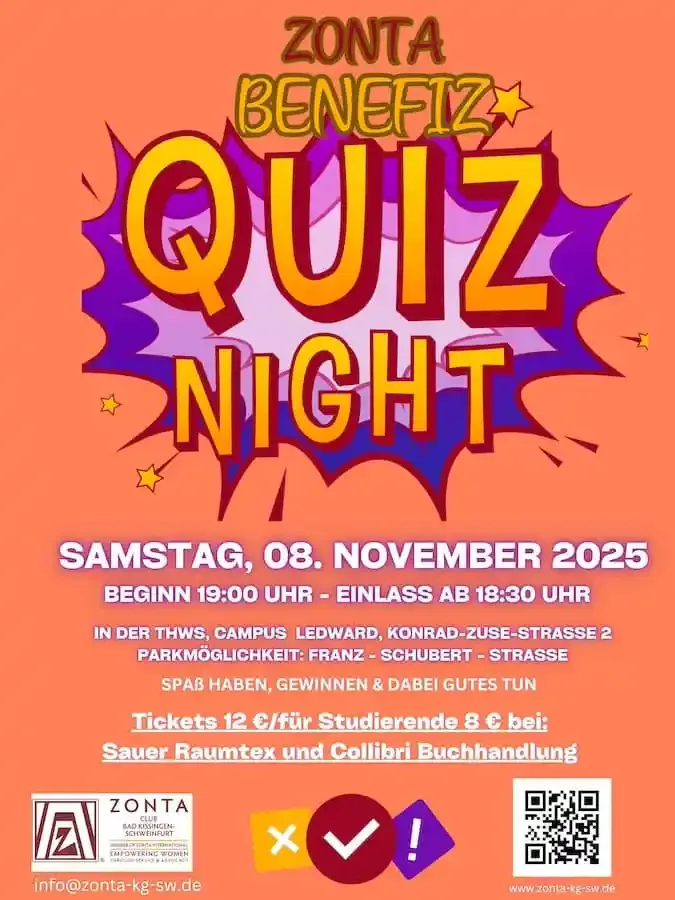 Spaß haben, sein Wissen testen, gewinnen und dabei Gutes tun – die „Zonta Benefiz Quiz Night“ macht es möglich. Nach dem großartigen Erfolg der Premiere im Mai dieses Jahres und auf vielfachen Wunsch der Teilnehmenden lädt der Zonta Club Bad Kissingen-Schweinfurt am Samstag, 8. November 2025, um 19 Uhr (Einlass ab 18.30 Uhr) zur zweiten Auflage des beliebten Benefizformats in die Technische Hochschule Würzburg-Schweinfurt (THWS), Campus Ledward, ein.