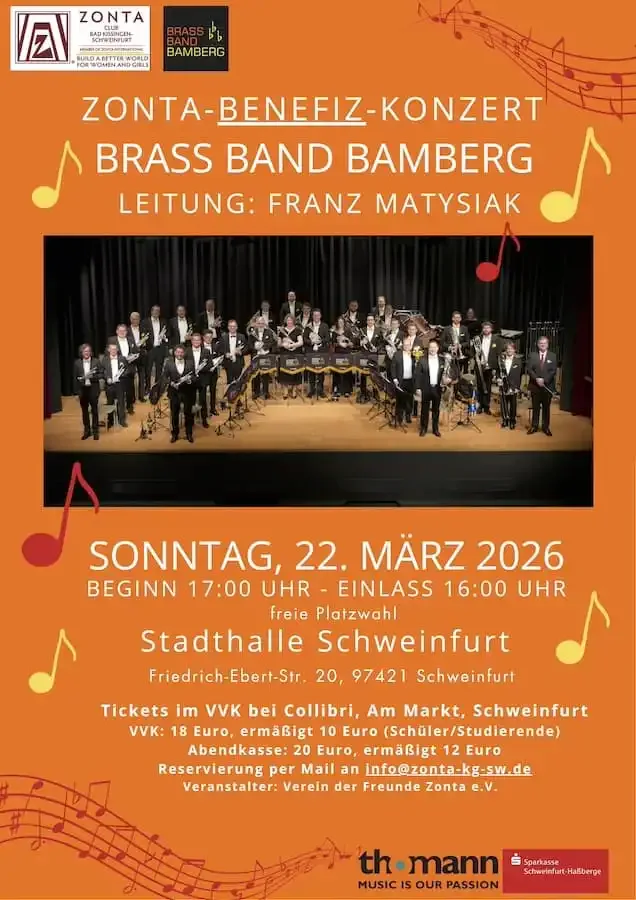 Ein musikalisches Highlight erwartet Konzertfreunde am Sonntag, 22. März 2026, in der Stadthalle Schweinfurt. Der Verein der Freunde Zonta e. V. und der Zonta Club Bad Kissingen-Schweinfurt laden zu einem besonderen Benefizkonzert ein. Unter dem Titel „Hymn of the Highlands“ entführt die Brass Band Bamberg das Publikum musikalisch in die Weite der schottischen Highlands – ganz ohne Franken zu verlassen.